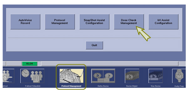 The Protocol Management Pop-up Window will open, confirm that Dose Check Management is one of the buttons displayed in this window.