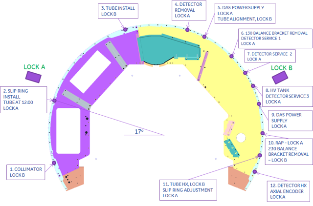 The gantry Rotational Service Lock is used to lock the rotating assembly in place and prevent it from moving. When looking at the front of the gantry, Lock A is located on the left and Lock B is on the right. Either lock can be used to hold the gantry in place. Depending on the service event, a predefined position from Figure 24 Gantry Service Lock Positions may give the best service access. Follow the instructions below to engage the Rotational Service Lock.