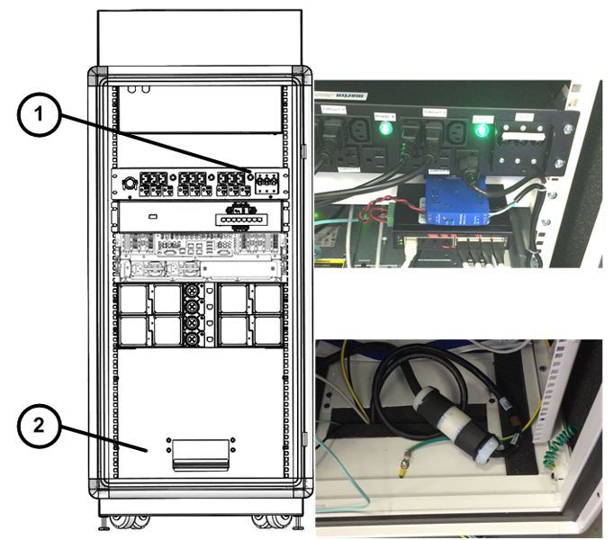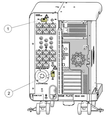 Power Off the System Cabinet by turning off the Circuit Breaker (Item 1 in Illustration below) inside the System Cabinet and disconnect the AC Power Inlet Twist-n-Lock connector (Item 2 in Illustration below). The Circuit Breaker in System Cabinet IV is located at the front of the PDU.