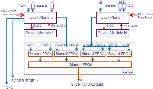 There are two backplanes which are separated into the High Channel and Low Channel board assemblies. The external interfaces with the exception of 48V power and serial data to the slip ring come in through the Low Channel backplane. The optical cables attach directly to the SDCB but come through a hole in the DAS Low channel backplane.