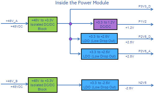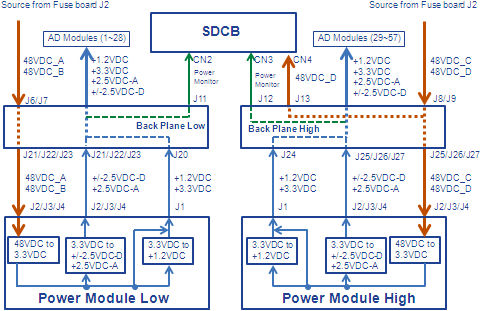 DAS Back plane receives 48VDC power from Fuse Board, and is sent to each Power module. Then Power module generates all of the power required to AD modules and send back to Back plane. The initial 3.3VDC DC/DC converter becomes the source of other voltage generator. That means if this 3.3VDC generator has an issue, then all of the power will be down. And they are provided to each AD module via Back plane. In Power Modules, 2.5VDC generator is separated for Analog use and Digital use (there are two generator modules). The power for SDCB (48VDC) is provided via Back Plane High. Back plane is exactly the board that has only connectors. For detail connection matrix, refer to BP Power Line matrix.