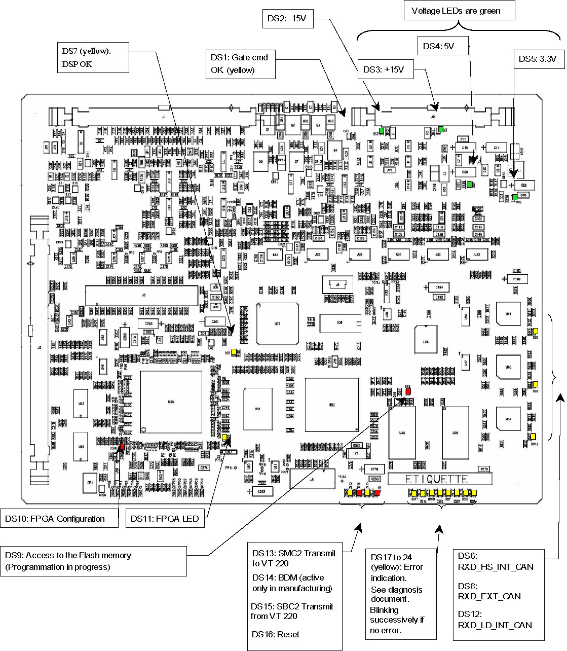 • Application mode: LEDs DS17 to DS24 are lit successively more slowly. The power up self tests are completed, PPC kV control board is up and running.