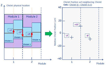 The bottom graph shows the Chiclet positions with respect to its neighbor. Each data point is the difference from next Chiclet position. One detector module contains four Chiclet, horizontal axis shows the module number, but the cross cursor is twice number. Last Detector module shows only one Chiclet.