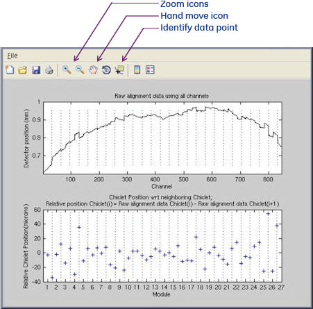 The zalignmentWizard is used to check the relative alignment of all detector modules in the detector. The key alignment is module to module across the detector for z axis. Each module must be within a specified distance of the module on each side. That means, for example, module 3 must be closed in alignment to both module 2 and module 4. In Merc40 detector, Detector module position is not adjustable, therefore this tool is used for the purpose of alignment confirmation
