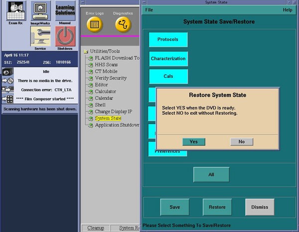 Insert System State DVD-RAM disk in Peripheral Tower. Perform Functional Checks>Console>Peripheral Tower Functional Test, DVD-RAM Checks and confirm files have been saved to disk.