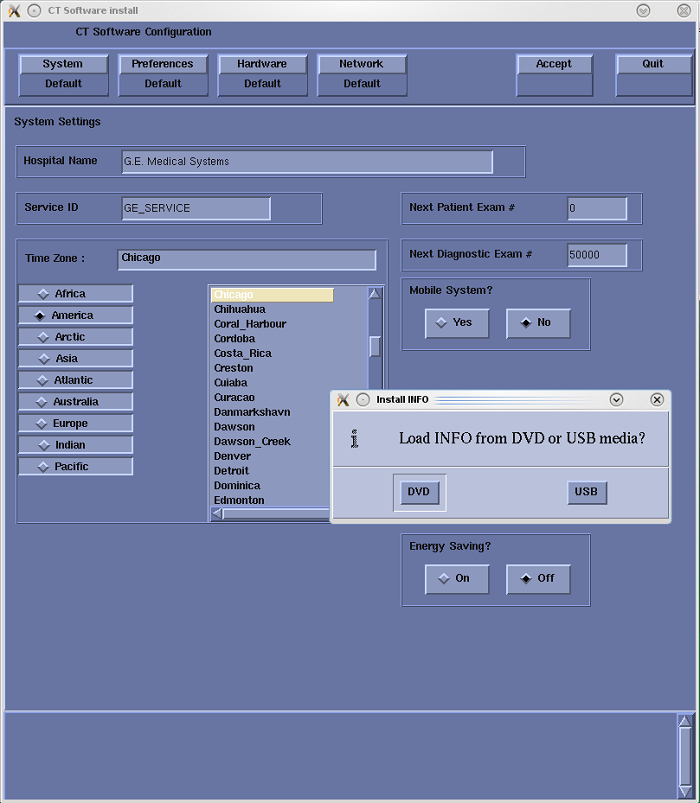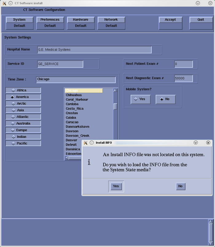 note: If a valid and current System State Backup media is not available, answer No and manually configure the Hardware Tab to define System and Console Type in accordance with the procedure Manually Configuring System INFO.note: If System State is NOT used, mini check of FRDM Wizard shall be executed in order to create Z Alignment Cal. vector. That is needed for scanning. - System State (Install INFO) Media Type decision window will