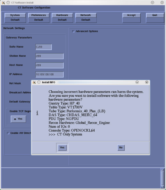 note: Install INFO detail in illustration will differ depending on System type. Verify that the Install INFO detail is correct for the system before selecting [YES]. - System Install INFO will be now used to create the CT Application load routine. Do not remove the Apps Disk until completed.