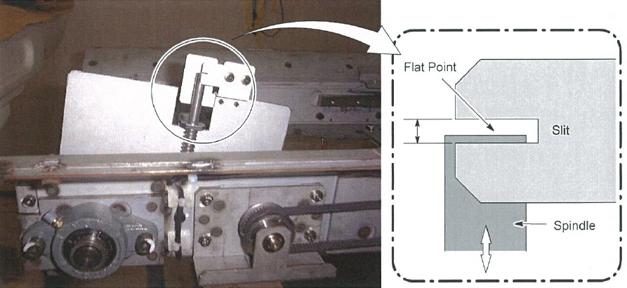 - Adjust position of the pulley so that the flat point of the spindle is in the narrow slit (see Figure 3), and fix the pulley.