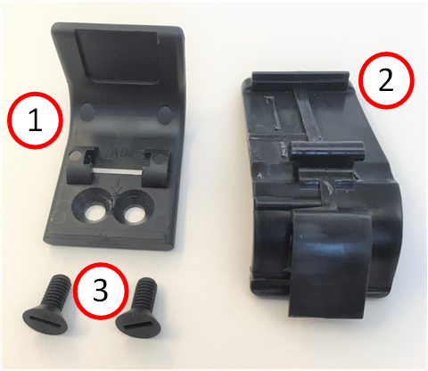The replacement latch kit is shown in Figure 1 below. The movable lever (Item 2) is designed to be removed for access to the mounting screws by popping the lever pivot arm from the latch base plate (Item 1). The lever can be easily pop off if the cradle extender is placed on a hard surface in a rough and haphazard way, leading the customer to believe either the latch is broken, or simply pops the lever back in place. Over time the lever pivot arm or the mating slot on the base plate becomes worn and the assembly must then be replaced.