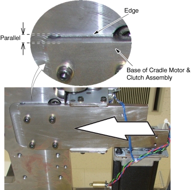 Verify that the base of cradle motor & clutch assembly is parallel with edge.