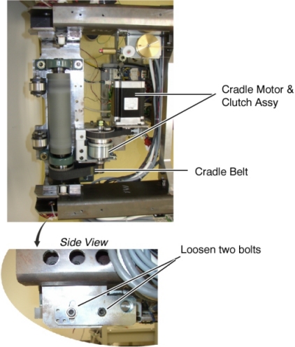 - Adjust the cradle belt tension according to Cradle Motor and Cradle Drive Belt Tension Adjustment.