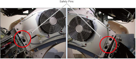 1. When power is restored to the gantry, check to make sure all 3 plenum fans are running. Use a piece of paper or similar object to make sure fans are pulling air into the plenum. A fan that is not running will still have the fan blades moving as air is pushed back out of the plenum through that fan port.
