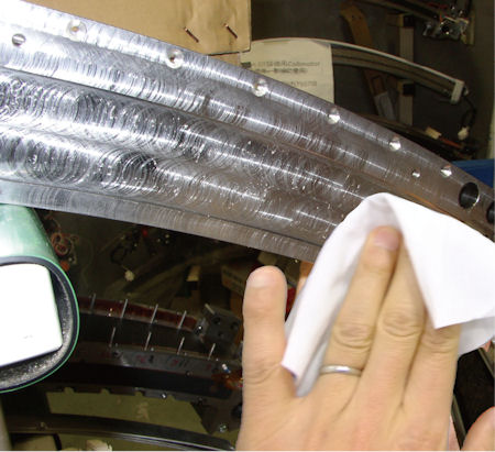 - Wipe off the remaining (old) adhesive completely from the attaching surface of the top collimator rail using alcohol pads (or equivalent).