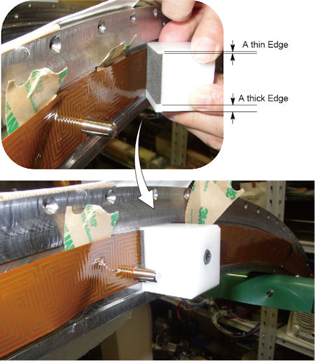 - Peel away the backing sheet of the heater gradually, and move the attachment tool along the groove in the side of the collimator rail to attach the heater to the collimator rail.