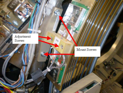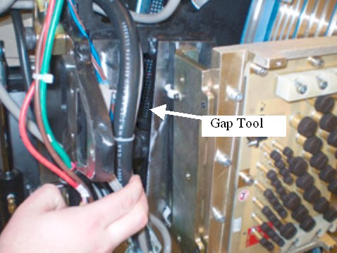 - Turn on the Gantry 120 VAC service switch and slowly rotate the gantry by hand while watching the gap between the receivers and antenna. Make sure the antenna never touches the two receivers.