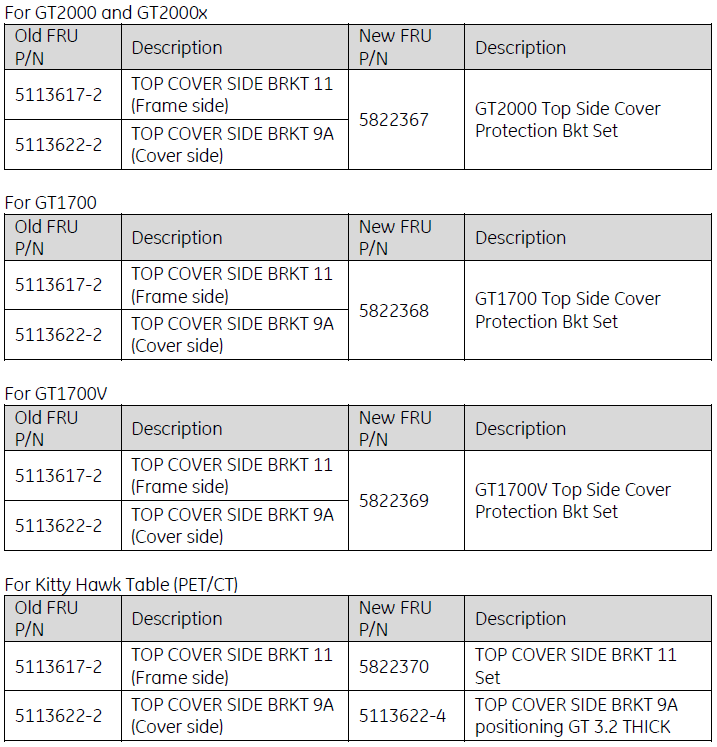 The following FRU kits were prepared for field upgrade of the brackets.