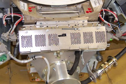 3. With power removed from the gantry, turn the position adjuster to position the large/small bowtie filter assembly so it is visible through the input port or tube side of the collimator assembly.