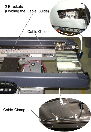 - Cut any tie-wraps, and remove all cable clamps holding the linear scale cable to the Table.