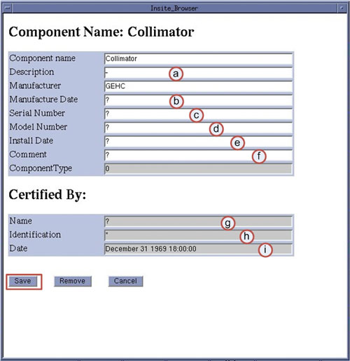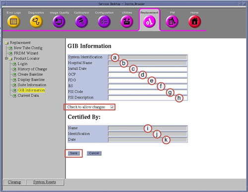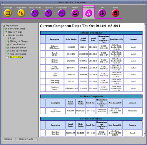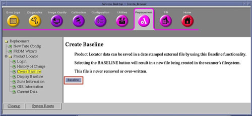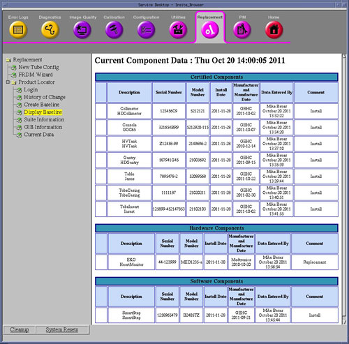 Component identification is accomplished through serial numbers and model numbers. This information is provided with the components either from the Manufacturing facility or from any replacement part. This procedure provides a means of updating the component identification information as the parts are installed or changed. At any appropriate time, the Service personal can create or modify the data using a fill-in-the-form design. The resultant data is then written to a database for future recall. To support the needs for Electronic Records, each change of the part’s history requires a User Identification/Login (to record who made the change) and a date (to record when the change was made). The changed information is then added to the database and does not erase any existing data. Part history information can be reviewed on the scanner using the Common Service Desktop (CSD) interface. Additional permanent records can be created by selecting the Baseline operation. These Baseline records can also be reviewed from the CSD.