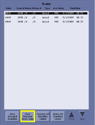 21. From the Scans pane of the Recon Management Save Scanfiles screen, click the [Save Selected Anon. Data] button as depicted in Figure 3. During the saving process, a Saving Scanfiles pop-up box will be displayed on the Scan monitor.