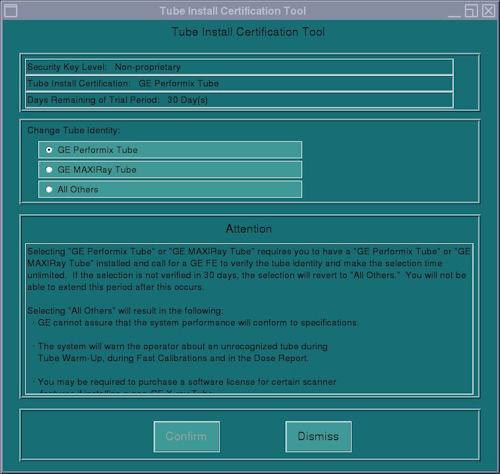 For GE Medical Systems Tube configuration, the Tube Install Certification Tool displays the number of Days Remaining in the Trial Period. A certified GE Field Service Engineer must confirm the tube identity during the trial period. If the trial period expires before a certified GE Field Service Engineer confirms the tube identity, the system will automatically default to "All Others" functionality.