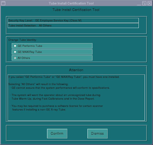 If X-ray tube is NOT GE authorized Tube, click ALL OTHERS from Tube Install Certification Tool Change Tube Identity pane.