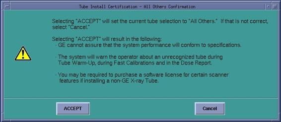 For GE Medical Systems Tube configuration, the Tube Install Certification Tool displays the number of Days Remaining in the Trial Period. A certified GE Field Service Engineer must confirm the tube identity during the trial period. If the trial period expires before a certified GE Field Service Engineer confirms the tube identity, the system will automatically default to "All Others" functionality.