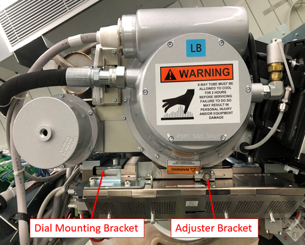 - Position the tube on the gantry: The “crosses” on the mounting plate and on the collimator should fit in perfectly when the tube is aligned properly