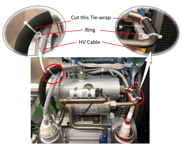 - Carefully cut tie-wraps securing HV cables. Note HV cable routing.