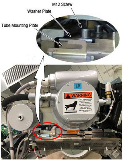 - Rotate the Gantry until the x-ray tube reaches the 3 o’clock position.note: It may be easier to loosen the M12 tube mounting bolts with the tube at about the 2 o’clock position before locking the tube at the 3 o’clock position. Simply loosen the tube mounting bolts one half (1/2) turn. Do not remove the bolts yet.