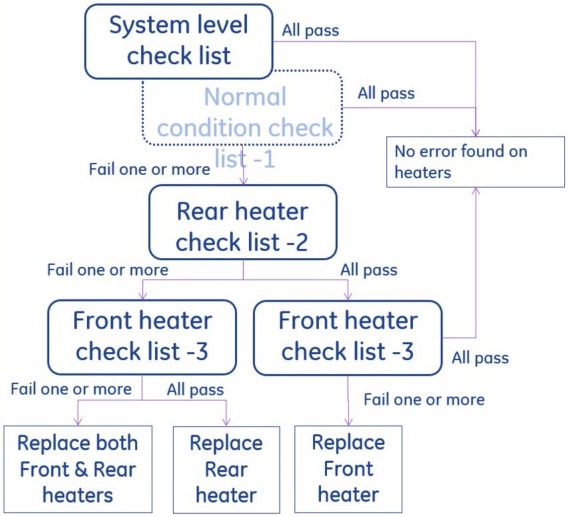The following Illustration shows the procedure of each heater check. Normal Condition, Front heater check and Rear heater check.