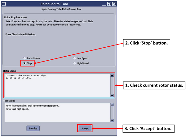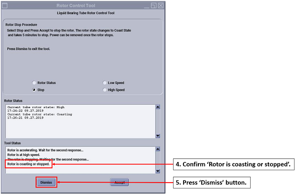3. Confirm that the Tool Status shows Rotor is coasting or stopped and press Dismiss button to close the tool.