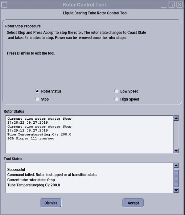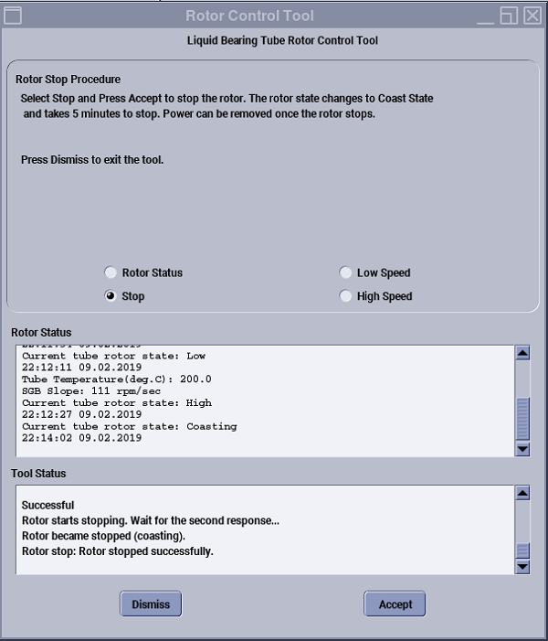 - Choose Stop button and Accept to stop the rotor when it is running in High Speed or Low Speed.