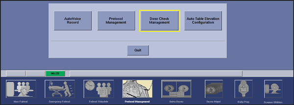 - The Protocol Management Pop-up Window will open, confirm that Dose Check Management is one of the buttons displayed in this window.