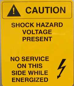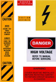 If a secondary cover can be removed and it potentially exposes a service person to an uninsulated electrical hazard, a warning label is applied to or near the secondary cover. In the gantry, voltage hazards in excess of 120VAC have been labeled. However, the 120VAC present in the gantry also is capable of causing electrocution. See Figure 2 for some of the label types used in the gantry.