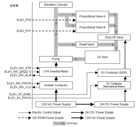 The Table has two modes of speed for Upward and two modes of speed for Downward. The Inverter makes the PWM signal and sends it to the Pump automatically to make a smooth ramp of speed according to the ELEV_SPD signal. The Pump is controlled by the Inverter, and puts oil into the Elevation Cylinder. The Relief Valve opens its own valve mechanically when the oil hydraulic pressure is higher than its threshold.