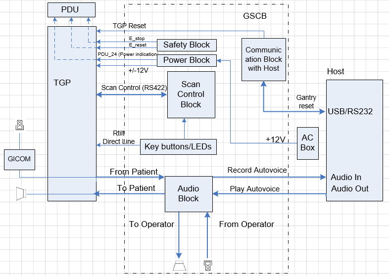 The GSCB is a component of the CT system. The following diagram shows the overall structure. The GSCB interfaced to the host PC and TGP board of the Gantry subsystem. The Host workstation is the control central of the whole CT system, The TGP is the main controller of the Table, Gantry and PDU. The GSCB is a user interface to the technician as the front end of the scan control loop. (See Figure 2.)