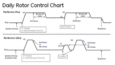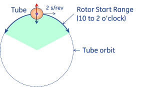 The gantry will start the rotor, in High Speed, when the tube is between 10 o’clock and 2 o’clock, with the gantry speed at 2 s/rev. This ensures that centrifugal forces cancel gravitational forces on the rotor, which minimizes wear during rotor start.