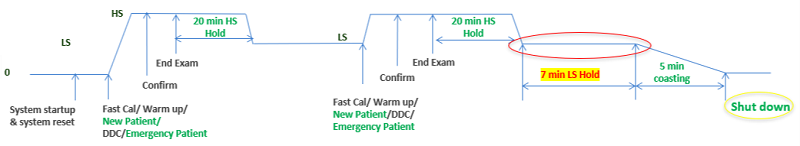 The system will keep rotor speed in HS during the patient exam. (Rotor speed will be HS for the Stationary (Scout) and the Rotational (Axial) series.) If the rotor is in HS, system will decelerate the rotor to LS with passing 20 minutes after completing the Fastcal and Tube warm-up, clicking end exam, completing the SV tools.