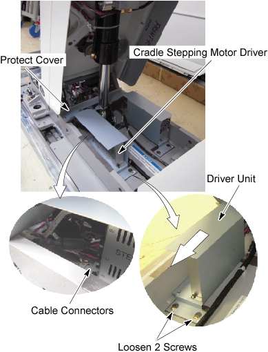 - Loosen 2 screws behind the stepping motor driver unit, and slide it away from the Gantry, and remove it from the Table.
