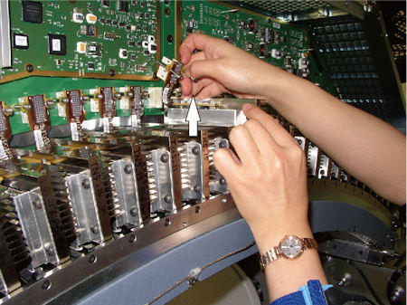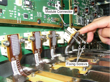 - Loosen 2 fixing screws of the module connector, and disconnect