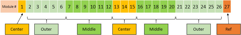 There are three kind of modules used in Merc40 Detector. The following shows the allocation map of module. Center module can be used to slot 27.