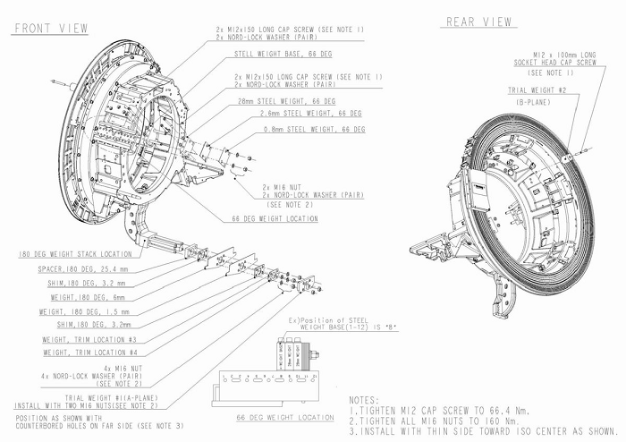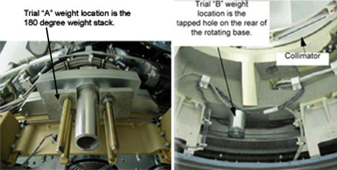 Trial weight A at 180° position must be installed over the top of the existing weight stack and nuts such that existing nuts are in recessed holes of trial weight. Install trial weight as shown in the Weight Diagram on the system. This is the configuration and weight components expected by the program.