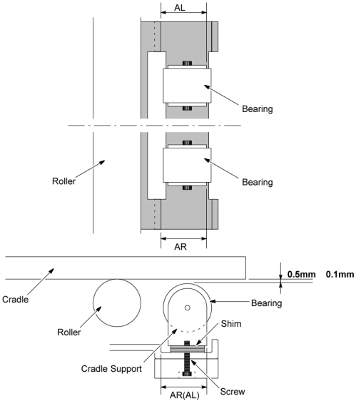 - Remove the screw, then adjust the gap between the cradle and the cradle support bearing by using the shim, so that the gap becomes 0.5 ± 0.1 mm .