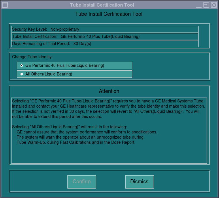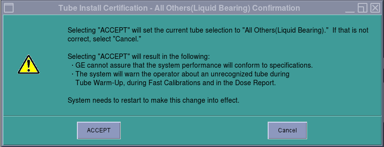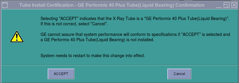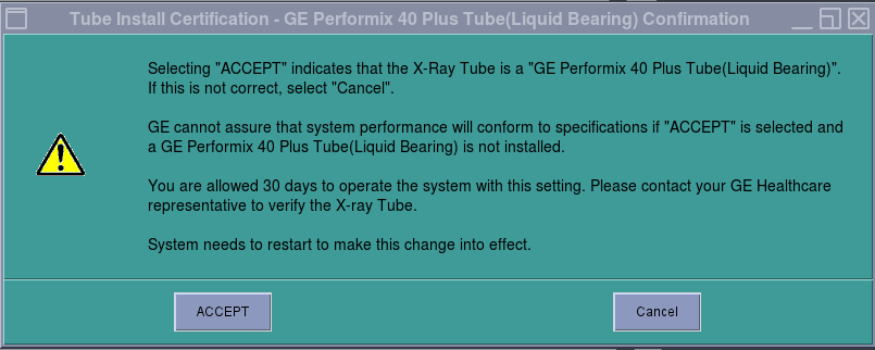 - Click Accept and click OK in the next pop up window. Tube Install Certification Tool top pane is updated as depicted in Figure 12 or Figure 13.note: For GE Medical Systems Tube configuration, the Tube Install Certification Tool displays the number of Days Remaining in the Trial Period. A certified GE Field Service Engineer must confirm the tube identity during the trial period. If the trial period expires before a certified GE Field Service Engineer confirms the tube identity, the system will automatically default to "All Others" functionality.