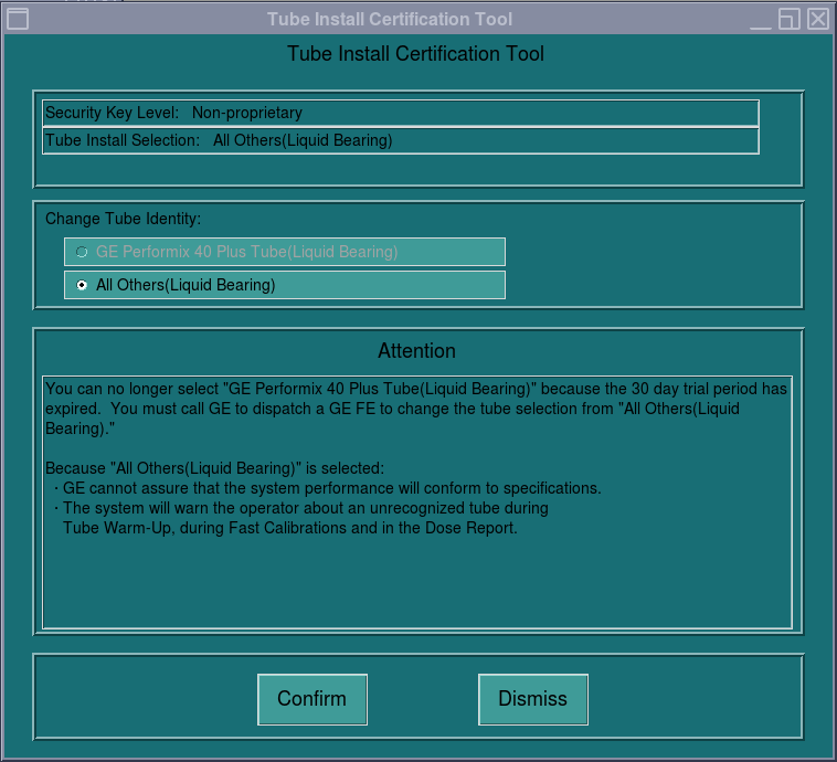 note: In case of Trial Period expiration after the 30 days, GE Performix 40 Plus (Liquid Bearing) radio button greyed.Figure 13. All Others Tube Install Certification Expired Screen