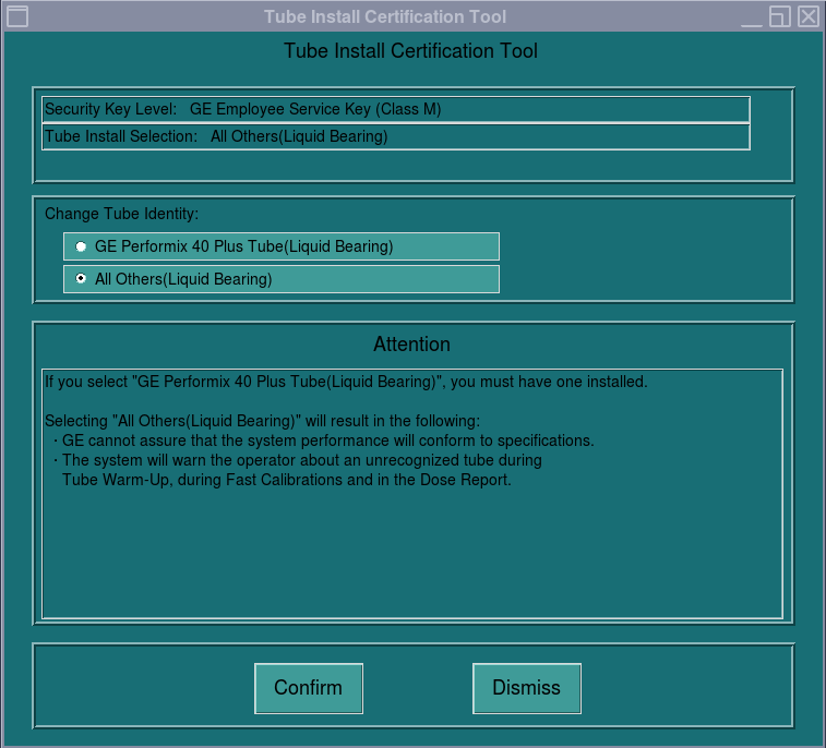 Figure 2. Initial Tube Install Certification Tool Screen - with GE Employee Service Key (class M) plugged in