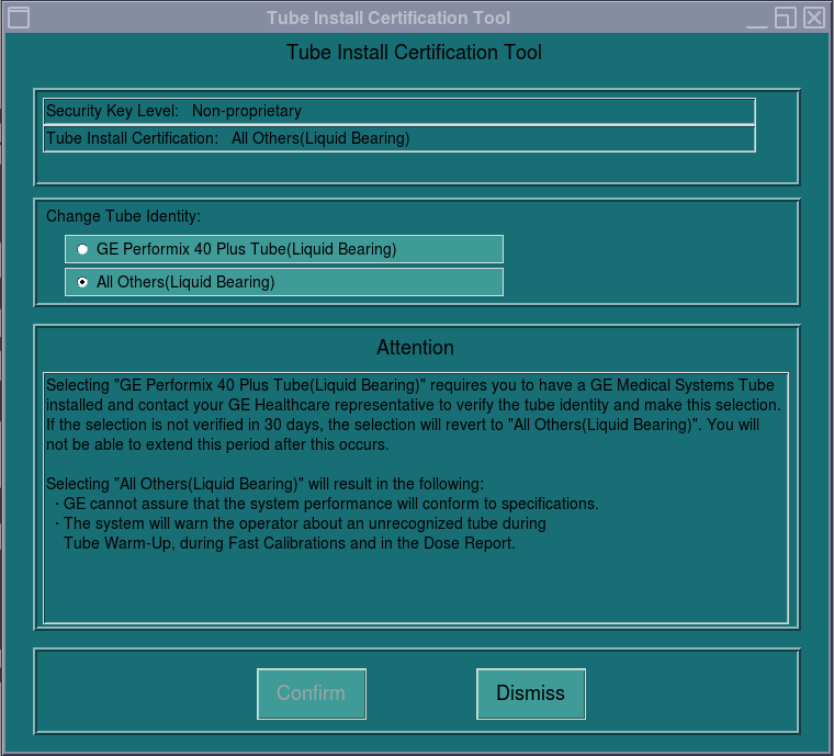 If X-ray tube rating plate Tube Insert Model Base Number is NOT 5401074, keep All Others (Liquid Bearing) selection from Tube Install Certification Tool Change Tube Identity pane.
