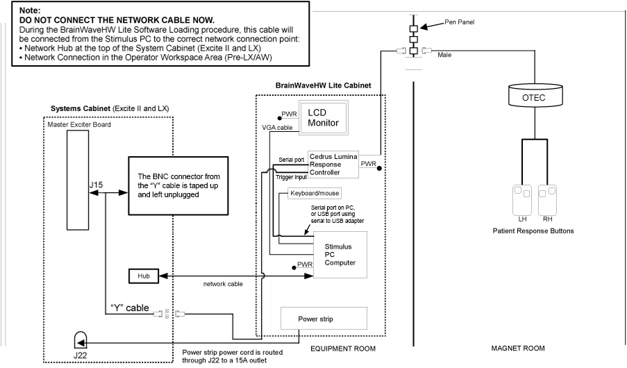 The GE BrainWave Lite option consists of software and hardware that can be used in combination with third party hardware to present fMRI patient stimuli synchronized with MR scanning. This document describes the hardware installation for this option. The hardware consists of the BrainWave cabinet located in the equipment room, the response system including response pads, and connecting cables. Cable runs must be made from the magnet to the penetration panel, from the penetration panel to the BrainWave cabinet, from the systems cabinet to the BrainWave cabinet, and from the BrainWave cabinet to the control room.