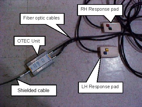 The outputs from the response pads and the system trigger from the systems cabinet are routed through the response system electronics and then to the serial port of the Stimulus PC.